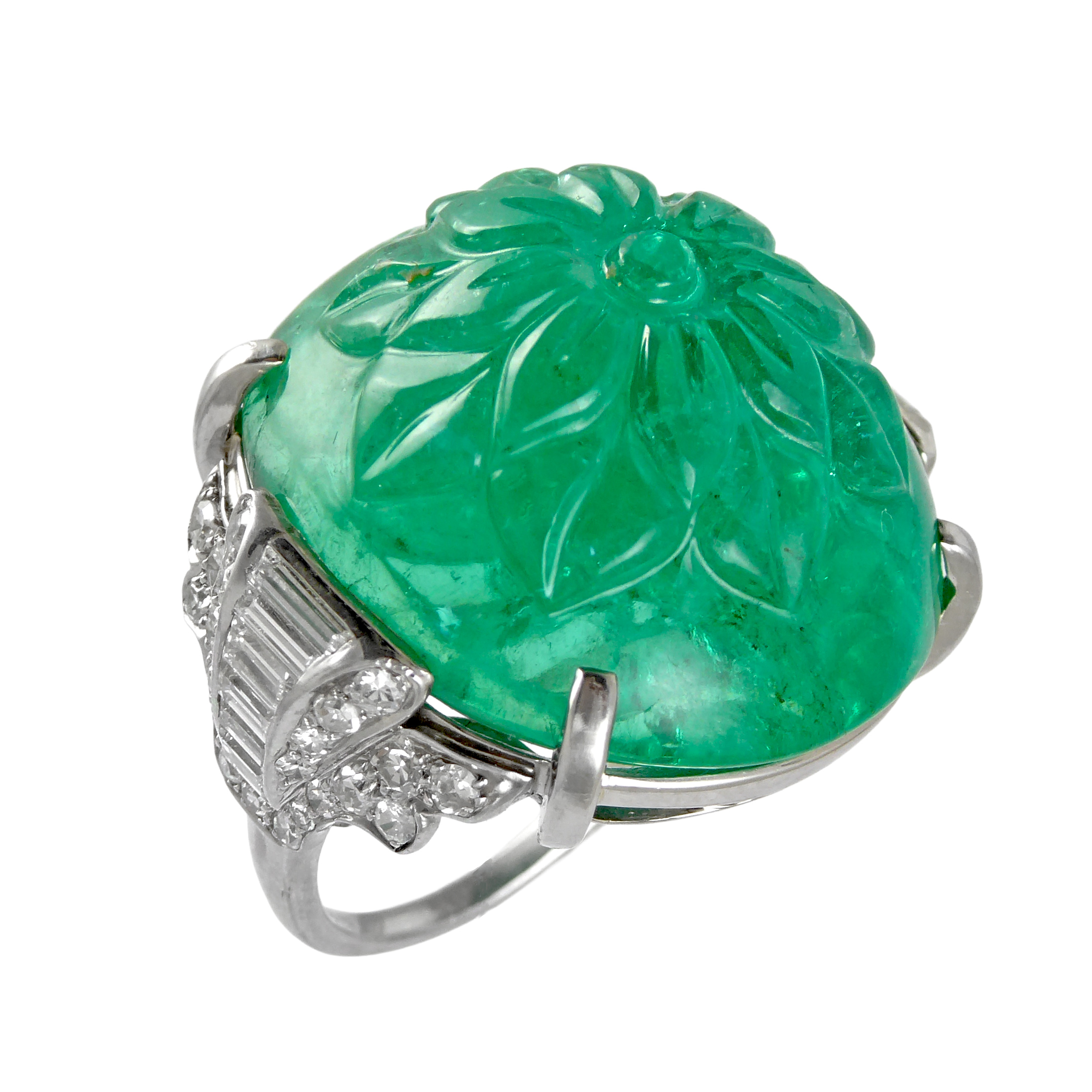 Art Deco carved emerald cabochon and diamond ring by Mauboussin, with large dome shaped floral carved Colombian emerald of 50.87ct, probably Indian carved,