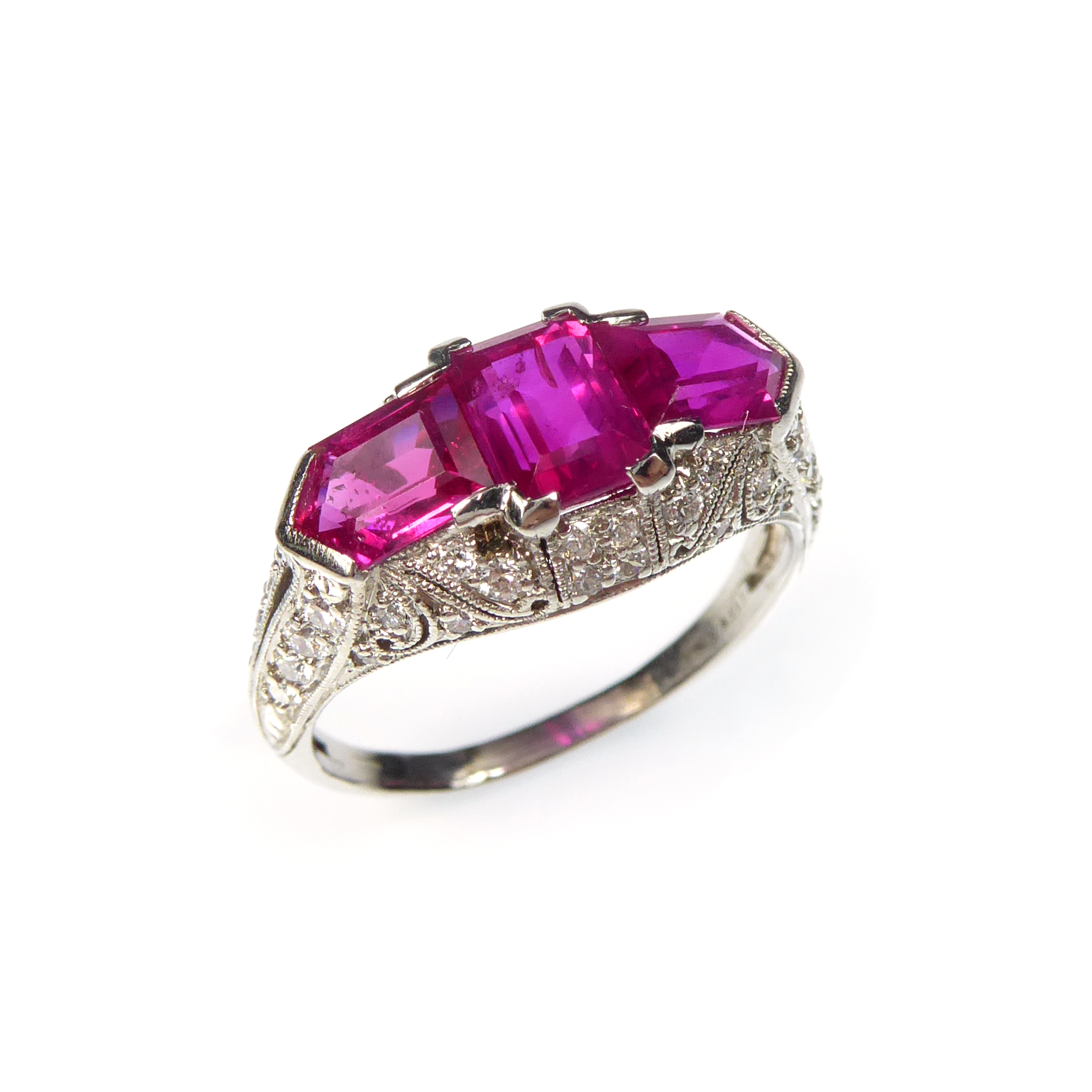 Early 20th century three stone rectangular cut ruby and diamond cluster ring by Tiffany, c.1910